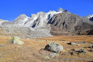 The 5-day trek to Nanda Devi National Park was more productive photographically, with some fine clear weather and a good display of late-flowering plants along the way. It is a tough 3-day outbound trek to reach Dharansipass via Lata Kharak, with some precipitous cliff-hanging paths to negotiate, but the far-reaching views of Nanda Devi, other glacier-flanked peaks and the deep Rishi Ganga gorge from the park boundary are simply awe-inspiring. Surrounded by wild mountains, a handful of Bharal (Himalayan blue sheep) grazing nearby and the occasional Tibetan fox traversing the scree slopes this is a true wilderness, far from civilization, where trekkers are unlikely to meet with anyone else.