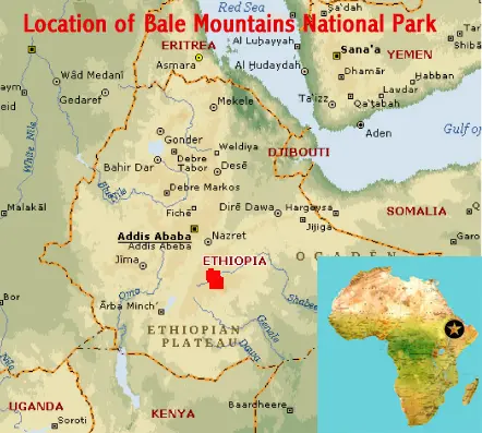 Location and Values: Bale Mountains National Park is located in the Ethiopian highlands, east of Africa’s Great Rift Valley.  It is an area of exceptional natural beauty with volcanic peaks and ridges, dramatic escarpments, sweeping valleys, glacial lakes, lush forests, deep gorges and numerous waterfalls.  It covers an exceptional range of altitude from Ethiopia’s second highest peak (Tullu Dimtu, 4,377m) into the southern lowlands at 1,500m, including the largest expanse of intact afro-alpine habitat in the world. More than 80% of all species found in this habitat (above 3,500m) are endemic.  There are exceptional levels of endemism in all taxonomic groups, with 177 endemic species of flowering plants (out of a total of 1,660 species documented for the park), 23 endemic mammals (out of 79) and 17 endemic birds (out of 363 species). Furthermore, the forests of the Bale Mountains serve as a genetic reservoir for Wild Forest Coffee and countless medicinal plant species.