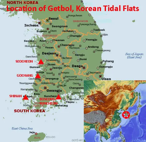 Location and Values: Getbol is the Korean term for the tidal mudflats that characterize the country’s western shore, bordering the Yellow Sea.  Similar mudflats extend around most of the shores of the Yellow Sea between China and the Korean peninsula, and this serial site includes four small areas selected to represent the diversity of geo-physical and ecological conditions exhibited by these tidal flats.  The four components are (from north to south) Seocheon (68 km2, representing an ‘estuarine’ type of Getbol), Gochang (55 km2, an ‘open embayed’ type),  Shinan (110 km2, an ‘archipelago’ type), and Boseong-Suncheon (60 km2, a ‘semi-enclosed’ type).