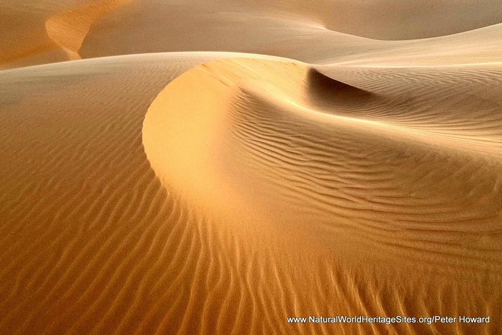Location and Values: ‘Uruq Bani Ma’arid is a vast area of hyper-arid desert located on the western edge of Saudi Arabia’s ‘Empty Quarter’ or Ar-Rub’ al-Khali.  This is the largest continuous sand sea on Earth and one of the Earth’s most spectacular desert landscapes with a wide variety of wildlife habitats. The area of the world heritage site supports greater biological diversity than any other part of the Ar-Rub’ al-Khali and features one of the world’s largest longitudinal sand dune systems.  The dune system overlies a dissected limestone plateau with vegetated wadis, gravel plains, and inter-dune corridors, with a steep escarpment punctuating its western edge. The variety of interacting natural habitats and continuous changes in dune formations driven by wind creates an ecological network of patterns and processes providing for the conservation of globally important plant and animal species.  ‘Uruq Bani Ma’arid is the last place where Arabian Oryx were observed in the wild, and it is now the focus of an intensive reintroduction program for Arabian Oryx and other threatened species, such as the Arabian Sand Gazelle, and Arabian Mountain Gazelle.